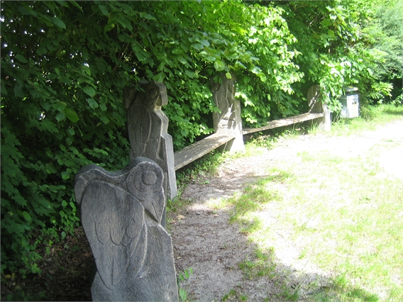 Der sogenannte Storchenspielplatz ist für Kleinkinder gut geeignet. Es gibt dort eine Vogelrutsche, zwei Spielhäuschen und eine Spiralwippe. Die Bank mit den Steinvögeln, einem Geier, einem Papagei, einer Taube und einem Paradiesvogel, hat die Forscher sehr beeindruckt. Ihr Spielvorschlag: Die Vögel nachmachen und die anderen müssen es erraten.