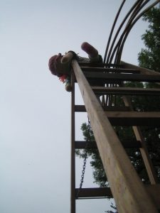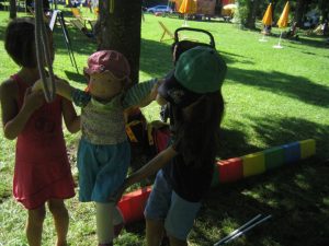 Laura und Emilia helfen ihr. Sie kriechen durch den Tunnel, balancieren und rutschen.