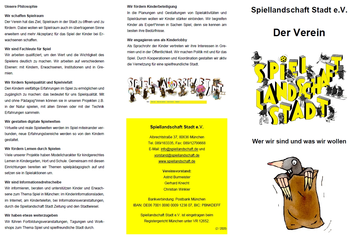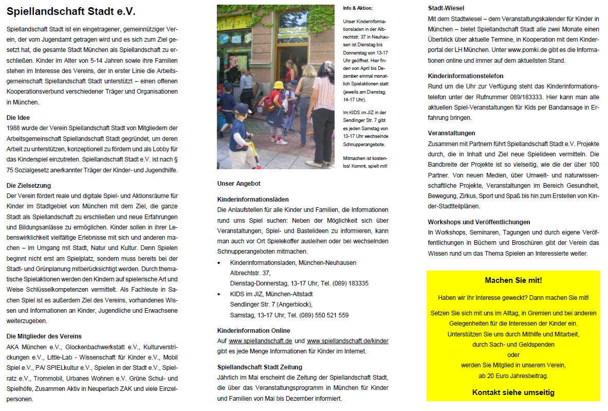 Daneben bietet er eigenständig Fortbildungen an und ist Herausgeber von Veröffentlichungen. Der Verein wurde 1988 gegründet, ist anerkannter Träger der Jugendhilfe (§75) und gemeinnützig. Mitglieder sind Vereine und Einzelpersonen aus den Bereichen Jugendarbeit, Stadt- und Raumplanung sowie der Weiterbildung. Der Verein und seine Mitglieder unterstützen den Ausbau der Arbeitsgemeinschaft Spiellandschaft unter dem Motto: „Spielen kann man überall“. Dies geschieht durch die Mitarbeit in Gremien und Arbeitskreisen, vor allem aber durch Modellprojekte, und mit der Kinderinformation. Sind Sie interessiert mitzumachen? Haben wir Ihr Interesse geweckt? Setzen Sie sich mit uns im Alltag, in Gremien und bei Projekten für die Interessen der Kinder ein! Werden Sie Mitglied – mit 20 € als Person oder 35 € pro Jahr als Organisation. Hier gibt es die Beitrittserklärung zum Download. Eine Broschüre mit weiteren Informationen zum Verein erhalten Sie hier. Zum Nachlesen können Sie sich hier unsere letzten Vereins-Newsletter herunterladen: