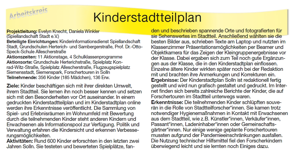 Inhalte: kinderrelevante Orten, Beurteilungen der Kinder ihres Stadtteils, Spannendes zur Stadtteilgeschichte, Besonderes im Stadtteil (Maskottchen), Wasser (wie Brunnen, Bäche) im Stadtteil, Bedeutung von Straßennamen, Rallyetour, Spiel- und Basteltipps, Rätsel, Spielplatzbewertungen, Tipps - Ein farbiger Plan mit kindgerechten Symbolen
