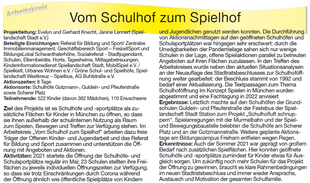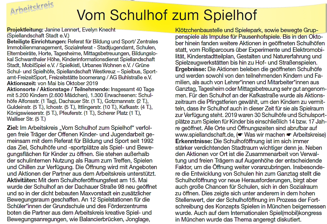 Seit 1993 gibt es in München das Projekt „Vom Schulhof zum Spielhof“ der Arbeitsgemeinschaft Spiellandschaft Stadt in Kooperation mit dem Referat für Bildung und Sport und dem Sozialreferat / Stadtjugendamt.