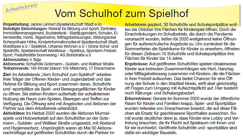 - Fortbildungen und Tagungen mit Expert*innen aus unterschiedlichen Fachbereichen zu Anforderungen an die Schulhofgestaltung sowie zu Spielanregungen