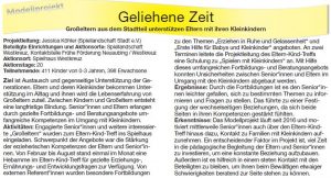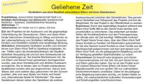 Das Modellprojekt läuft seit 2016 und motiviert mittlerweile Senior*innen auch über den Eltern-Kind-Treff hinaus dazu, Kontakt zu Familien mit Kleinkindern aufzunehmen. Ein entscheidender Faktor im Projekt ist, viel Zeit in die pädagogische Begleitung der Eltern und Senior*innen zu investieren, um eine konstante Beziehung aufzubauen. Außerdem ist es hilfreich in einem steten Kontakt mit den Beteiligten zu bleiben, um ihnen beim Bewältigen etwaiger Schwierigkeiten beratend zur Seite stehen zu können.