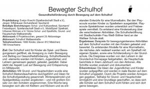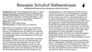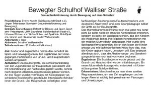Das Modellprojekt hat zum Ziel, die Gesundheit der Schüler in der Grund- und Hauptschule an der Walliserstraße beispielhaft zu fördern. Der Arbeitskreis Schulhof – Spielhof startet das Projekt im Schulhof Walliserstraße und erschließt ihn als Bewegungsraum für Kinder. Die Schüler werden in alle Projektphasen einbezogen. Sie werden gefragt, welche Bereiche sie wie nutzen und was verändert werden soll, damit sie auf dem Schulhof gerne Spielen, sich Bewegen und Entspannen können.