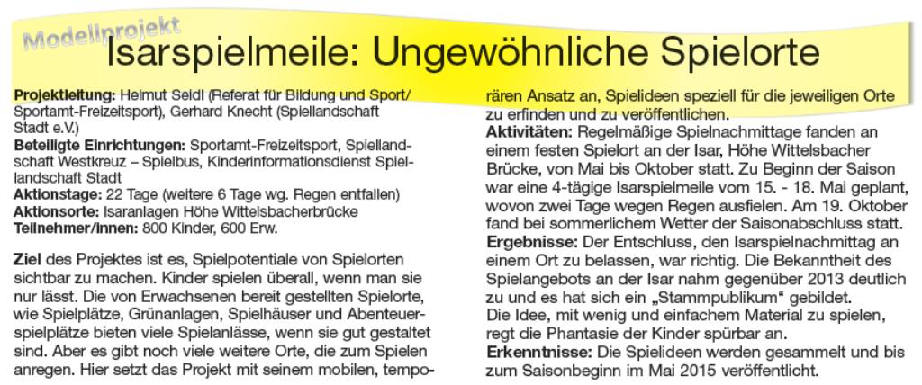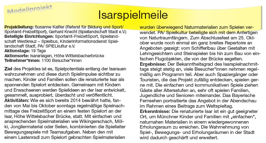 Die Isarspielmeile wurde gemeinsam mit dem Kinderinformationsdienst Spiellandschaft Stadt, dem Spielbus Westkreuz und dem Referat für Bildung und Sport, Abteilung FreizeitSport, entwickelt und umgesetzt.