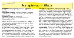 Nach einer zweijährigen Projektphase, in der zunächst modellhaft temporäre Spielangebote in den Isaranlagen an verschiedenen Orten durchgeführt wurden, etablierte sich ab 2014 der Isarspielnachmittag als ein regelmäßiges Angebot in den Isarauen unterhalb der Wittelsbacher Brücke. Seitdem sind die Isarspielnachmittag jeden Sonntag von Mai bis Ende Oktober fester Bestandteil des Münchner Spielekalenders.