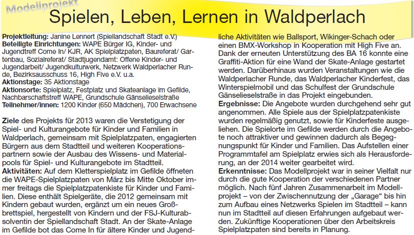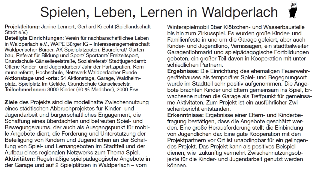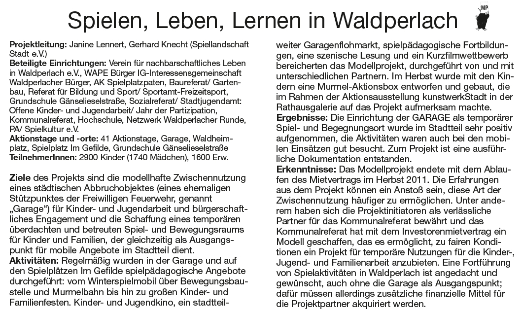 Gartengestaltung und gemeinsames Kochen, Murmelbahn und Wasserbaustelle, Vernissagen und Kinderkino, Garagenflohmärkte und mehr brachten Jung und Alt zusammen. Das Ergebnis aus zwei Jahren des großen ehrenamtlichen Engagements kann sich sehen lassen: Vereine, Initiativen und Einzelpersonen aus dem Stadtteil haben gemeinsam mit den Fachleuten vom Spiellandschaft Stadt e.V. 94 Aktionstage organisiert und über 10.000 Besucher und Besucherinnen angelockt. Dieses bundesweit einmalige Zwischennutzungsprojekt wurde 2012 mit dem Innovationspreis des BAG Spielmobile e.V. unter dem Motto „Zusammen geht’s besser“ ausgezeichnet.
