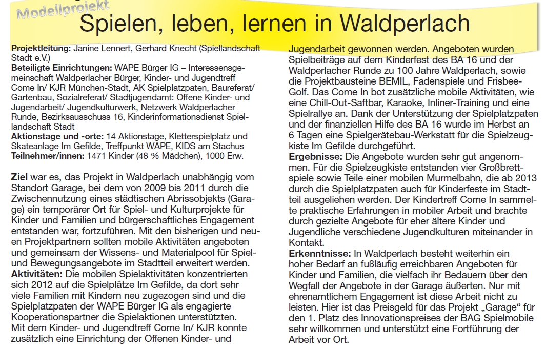 2012 wurde die Garage tatsächlich abgerissen. Das bedeutete aber nicht das Ende des Projekts „Spielen, leben, lernen in Waldperlach“. Angebote für Kinder und Familien wurden in den Sommermonaten auf die Spielplätze und an die Skatebahn „Im Gefilde 6“ verlegt. Der Spielbus brachte Frisbee- und Fadenspiele, Klötzchenbaustelle und Murmelbahn. Der Kinder- und Jugendtreff Come In / KJR konnte als neuer Kooperationspartner gewonnen werden und brachte sich mit der Organisation und Betreuung von Inlinertraining, Karaokestation, Saftbar und einer Stadtteilrallye ein. Dank der finanziellen Unterstützung durch den Bezirksausschuss 16 konnte die Spielplatzpaten-Spielekiste gemeinsam mit den Spielplatzpaten der WAPE mit tollen Spielgeräten gefüllt werden. Kinder und Erwachsene bauten gemeinsam drei große Holzbrettspiele und eine Murmelbahn. Diese Spiele stehen nun allen in Waldperlach zur Verfügung.