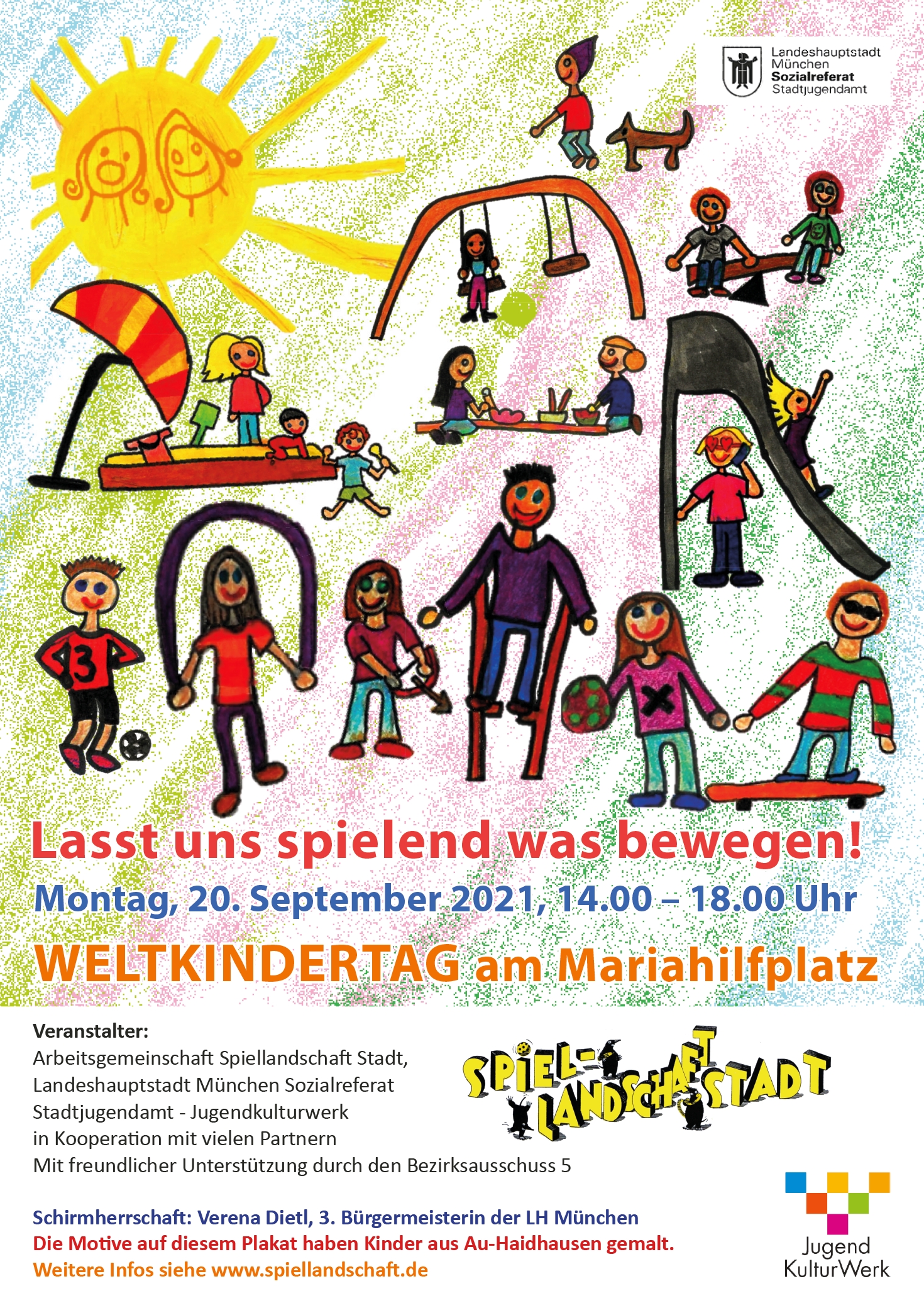 2021 stand Au-Haidhausen im Mittelpunkt unter dem Motto „Lasst uns spielend was bewegen!“ mit zentralen Aktionen auf dem Mariahilfplatz. HIER geht’s zu den Berichten zum Weltspieltag 2021 und zum Weltkindertag 2021.