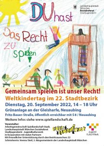 2022 steht der 22. Münchner Stadtbezirk (Aubing-Lochhausen-Langwied) im Zentrum des Projekts, unter dem Motto „Gemeinsam spielen ist unser Recht!“. HIER gibt es eine Nachschau zum Weltspieltagsfest 2022 und HIER aktuelle Informationen zum Weltkindertag 2022.